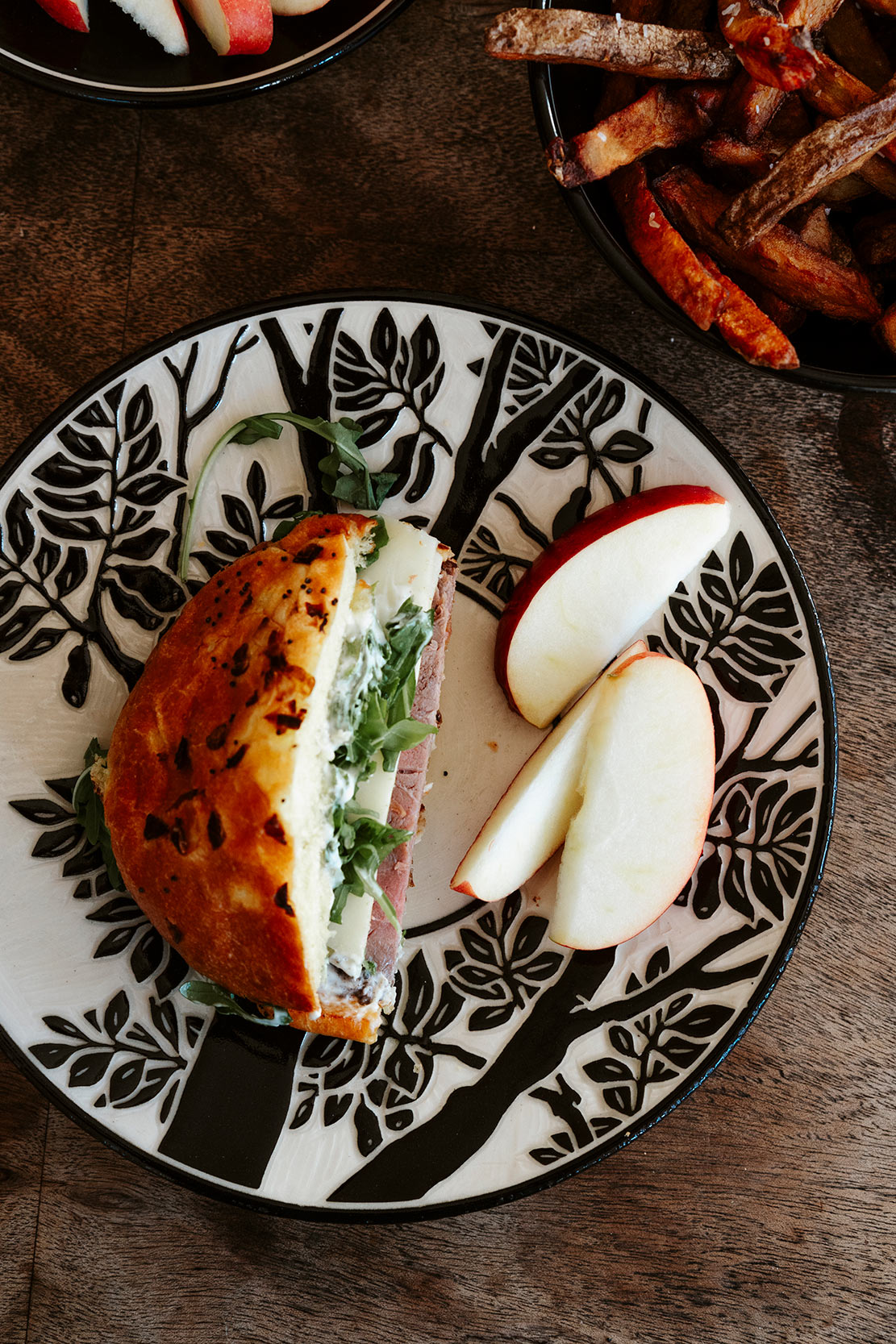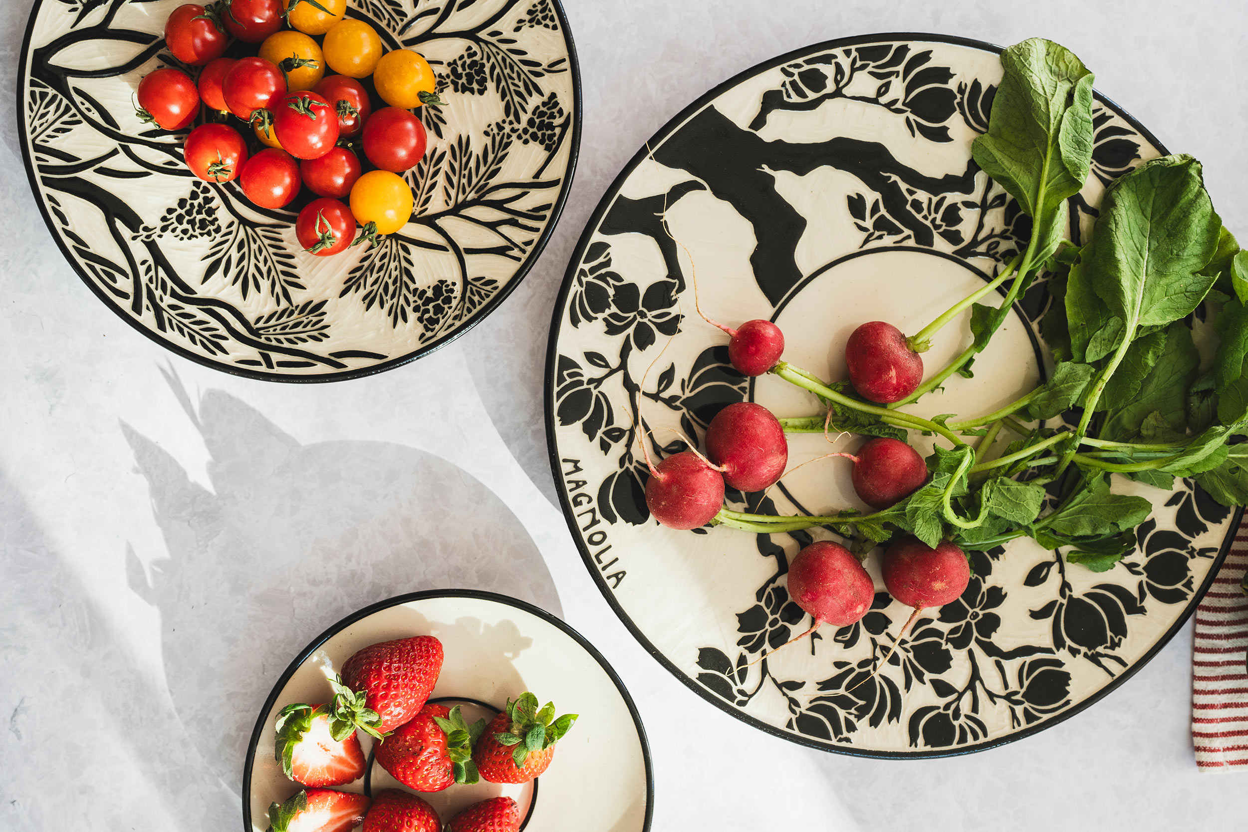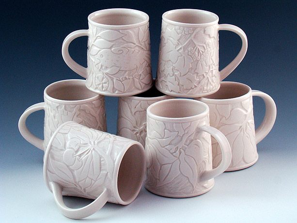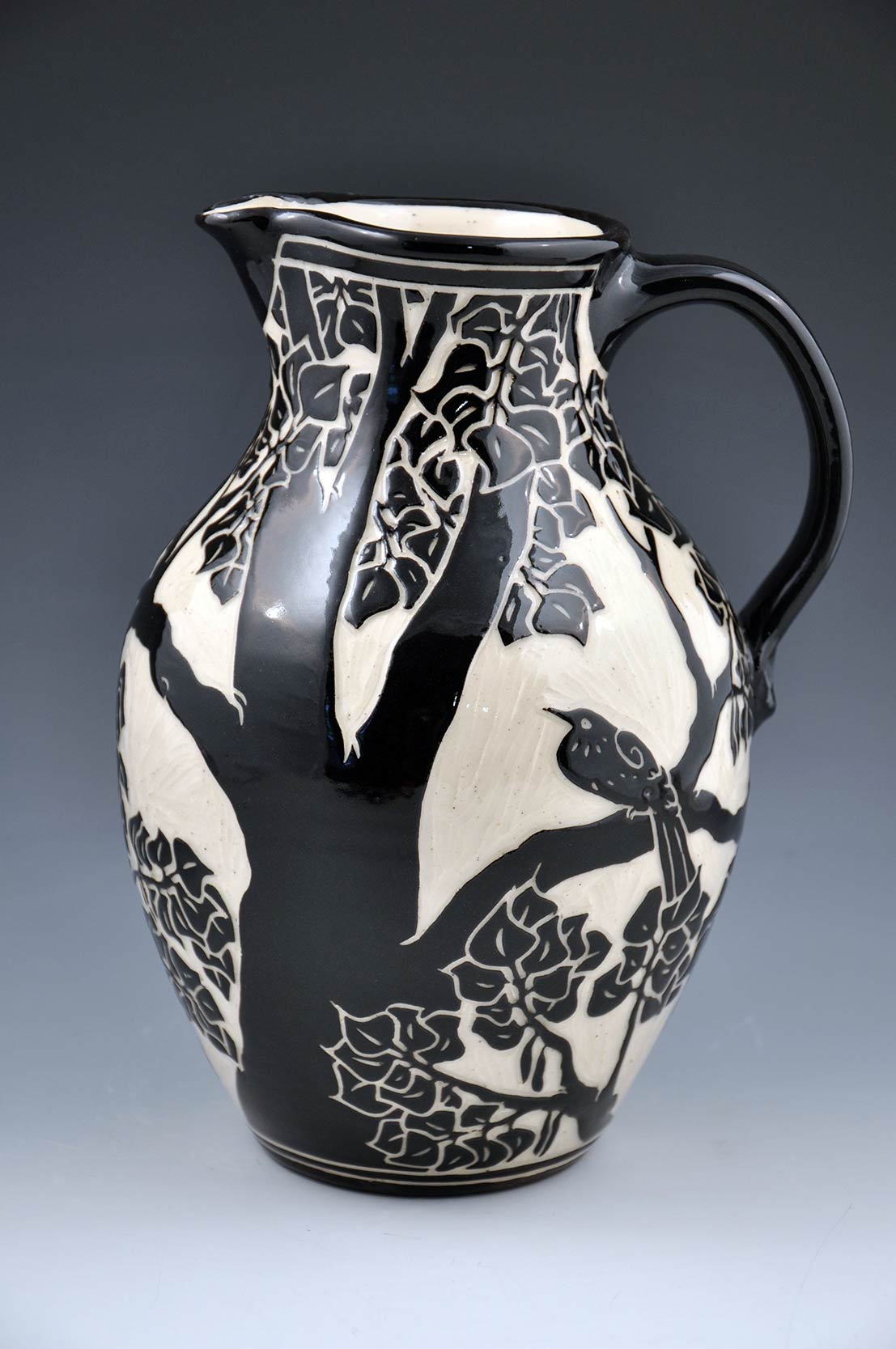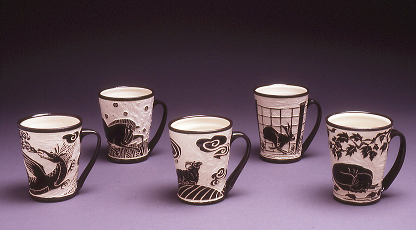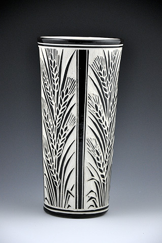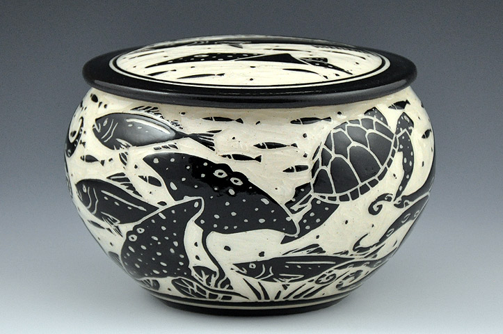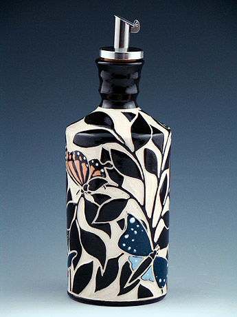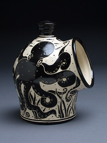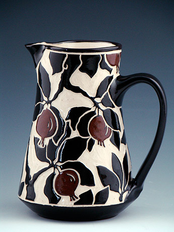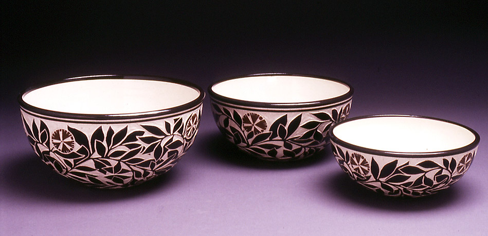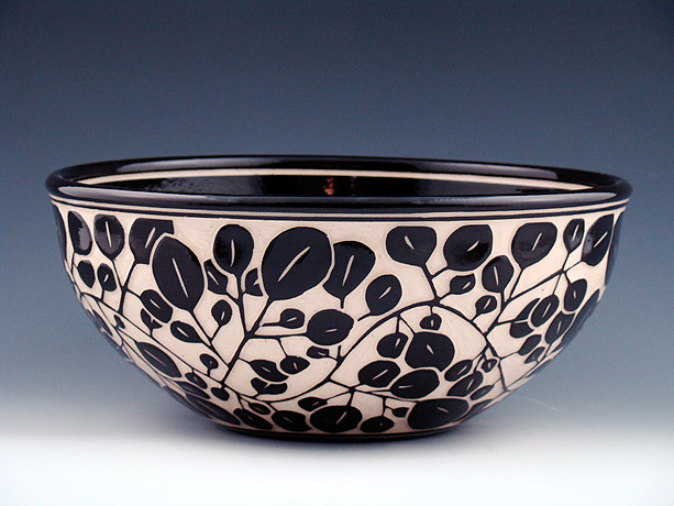 The Sgraffito Pottery line is a selection of black and tan functional ware decorated with a continually changing array of elegant botanical motifs, geometric patterns and stories. The decorative work is accomplished by using the traditional sgraffito technique, where a light clay body is layered with a black slip—a colored liquid clay. When the piece is half dry, "leather–hard," the images are sketched and carved onto each piece freehand. All of Katherine's pottery is finished with a transparent glaze and is dishwasher and microwave safe.
