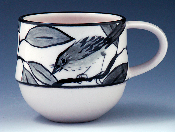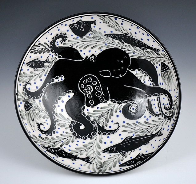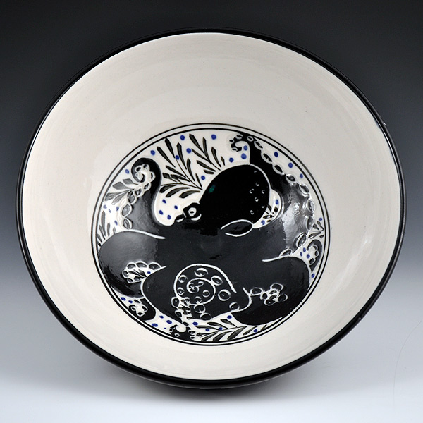 Katherine line of Brushwork Pottery is all hand–thrown on the potter's wheel from a fine porcelain clay. The imagery focuses on a variety of food crops, botanical motifs and animals. The decorative work is accomplished by using traditional Japanese brushes to apply strong black underglazes and bright additions of color to the smooth white porcelain pieces. All the images are sketched and brushed onto each piece freehand. All of Katherine's pottery is finished with a transparent glaze and is dishwasher and microwave safe.